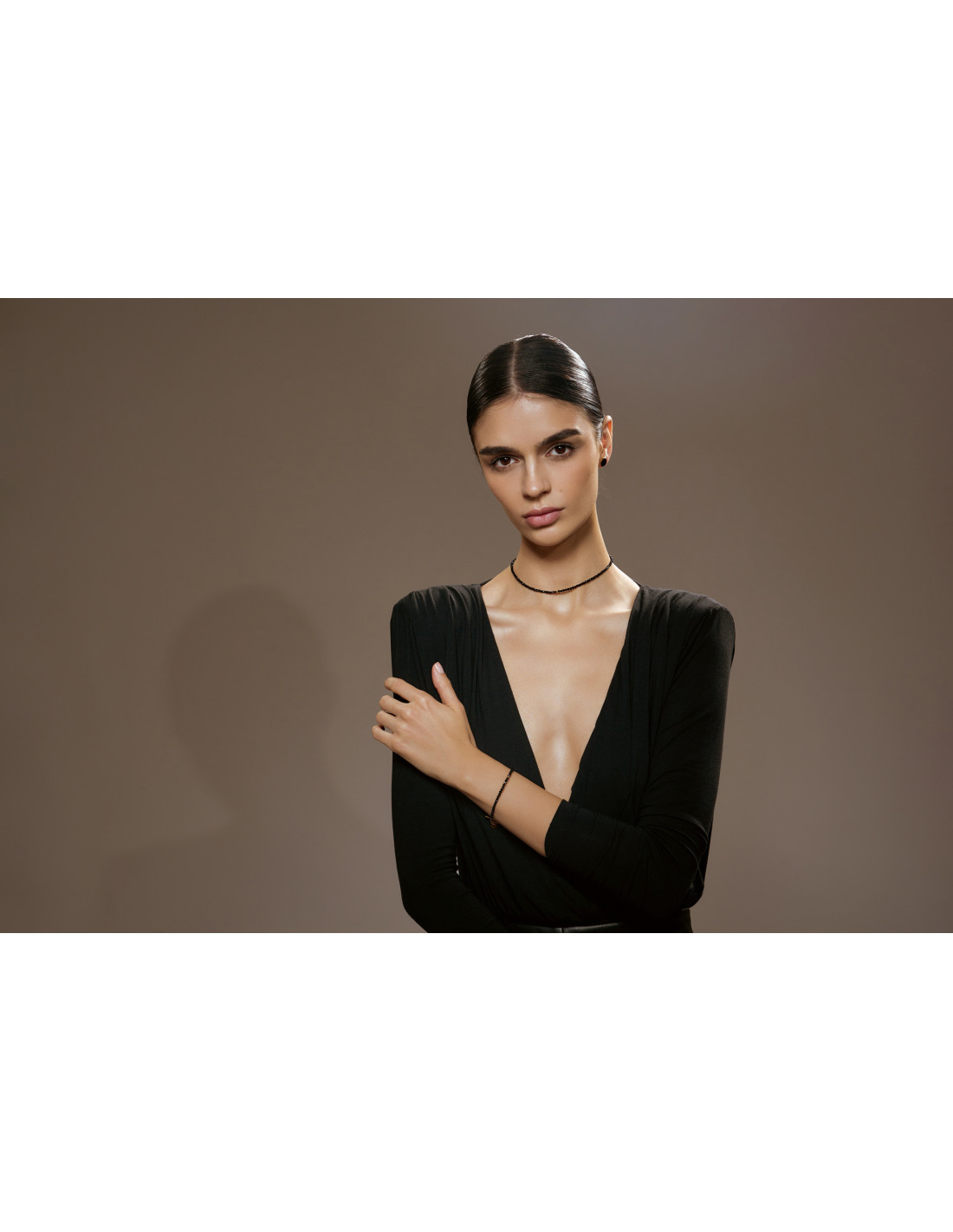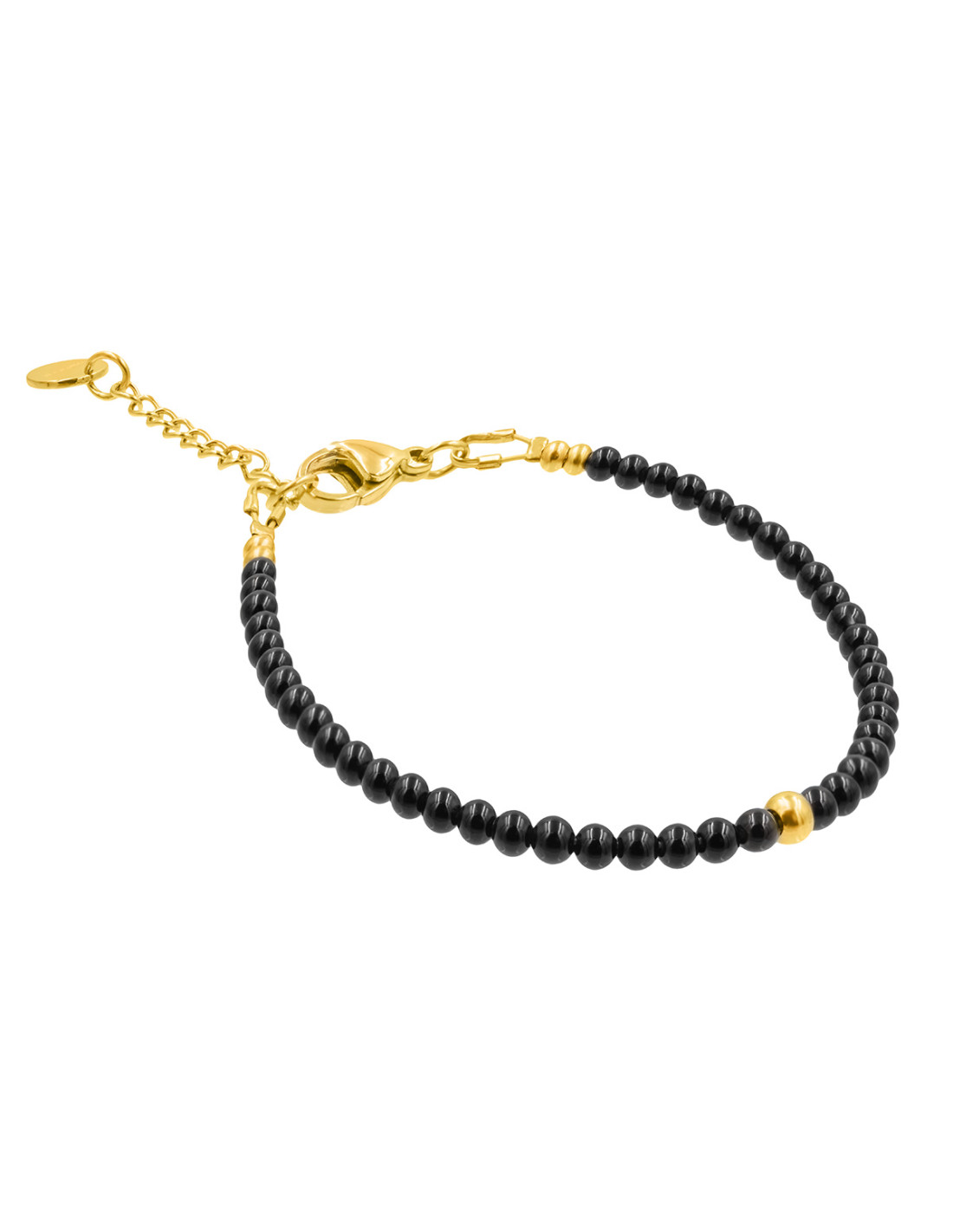 Delikatna regulowana bransoletka z drobnych, 3 mm kamieni onyksu i kuleczek ze stali szlachetnej w odcieniu srebra lub złota to połączenie subtelnej elegancji i nowoczesnego minimalizmu. Regulowane zapięcie w kolorze złota lub srebra dodaje jej wyjątkowego uroku.