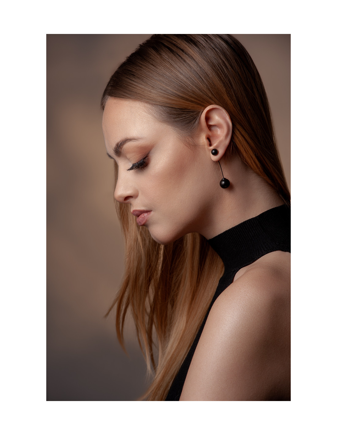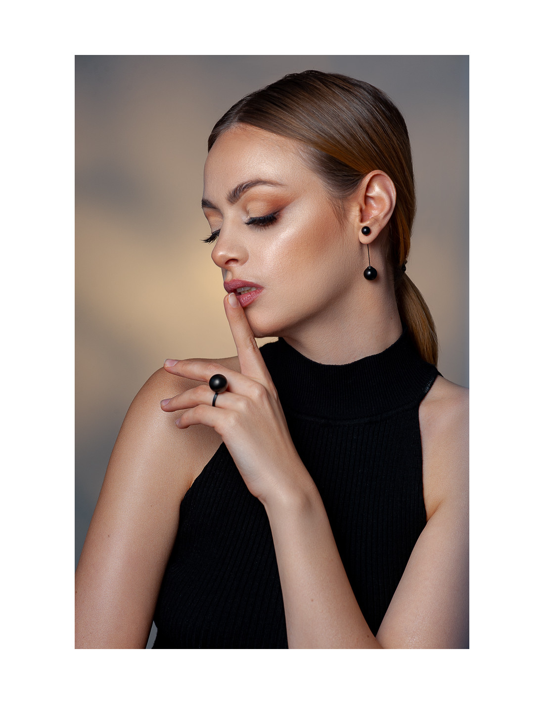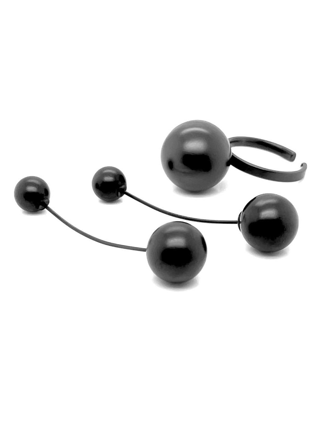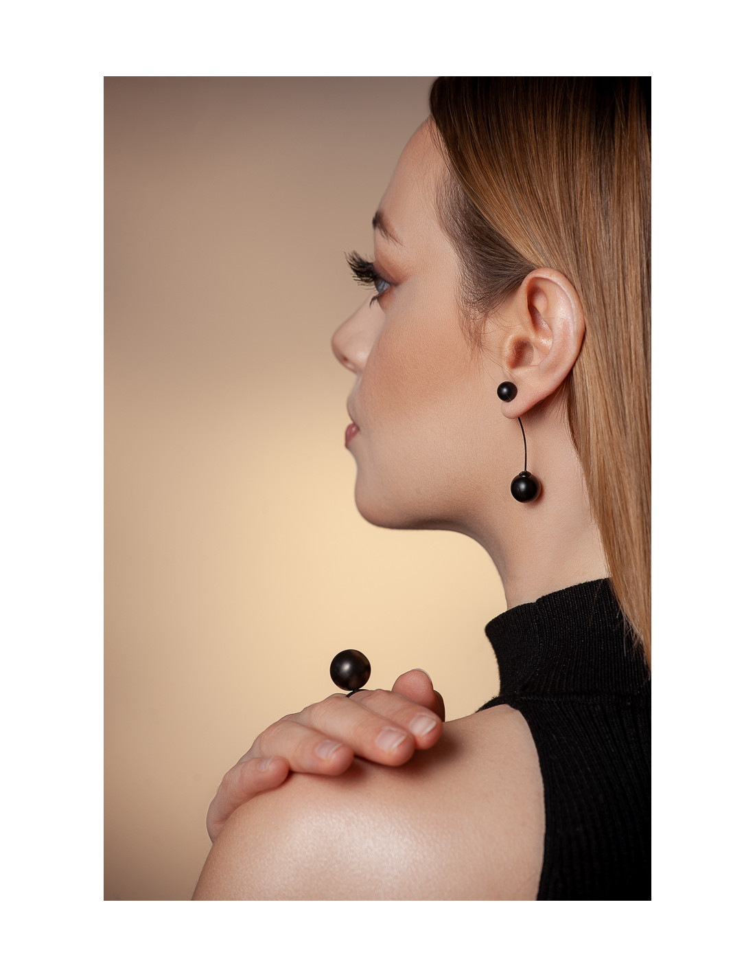 Stylowe kolczyki z matowej czarnej stali szlachetnej ozdobione dwiema kulkami. Subtelne i nowoczesne, doskonałe na co dzień i specjalne okazje.