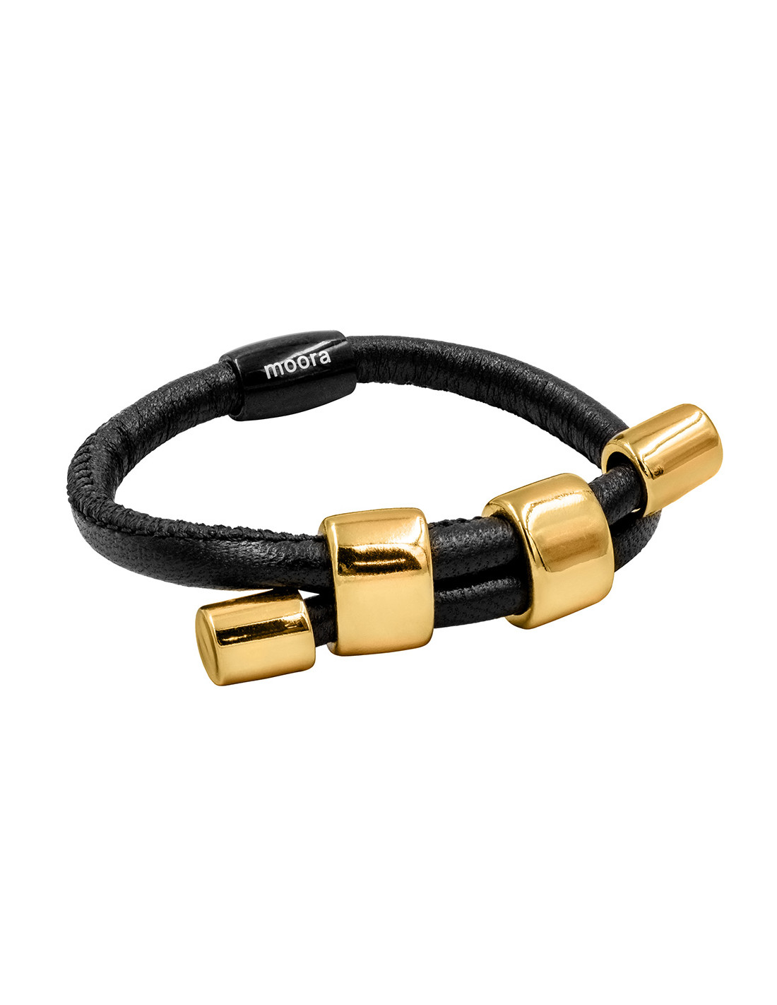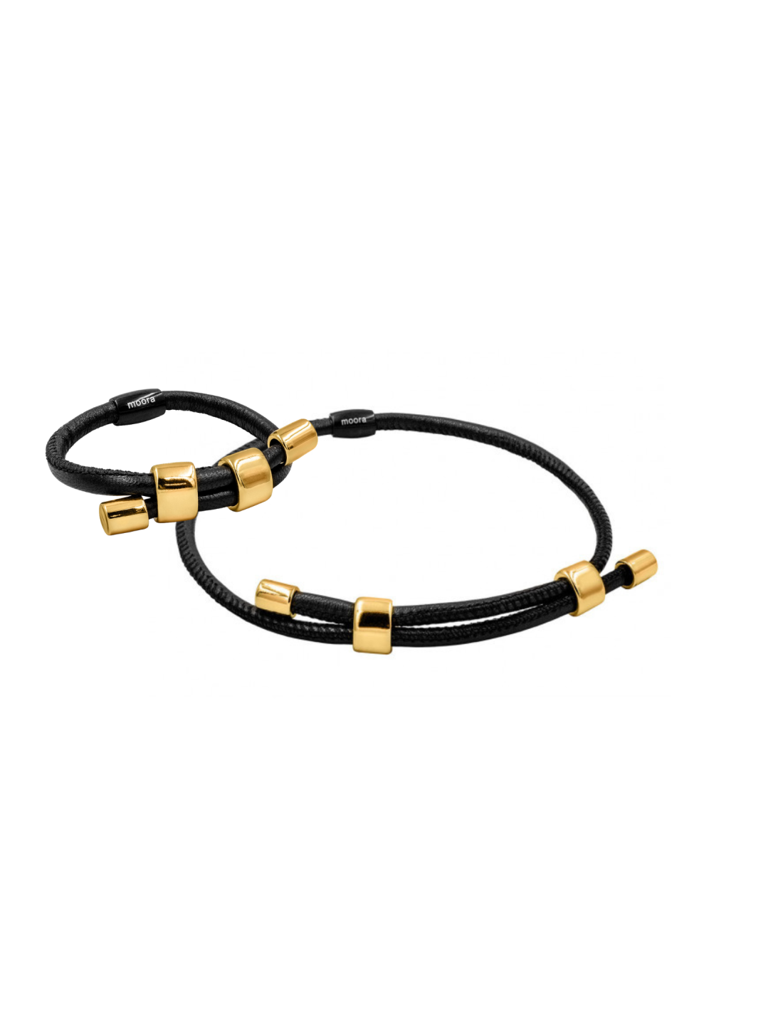 Nowoczesny komplet wykonany z ręcznie szytego rzemienia skórzanego na bawełnianym rdzeniu. Połączenie czerni skóry i złotego odcienia stali szlachetnej tworzy elegancki i ponadczasowy zestaw. Dzięki regulowanej długości komplet świetnie dopasowuje się do indywidualnych potrzeb.